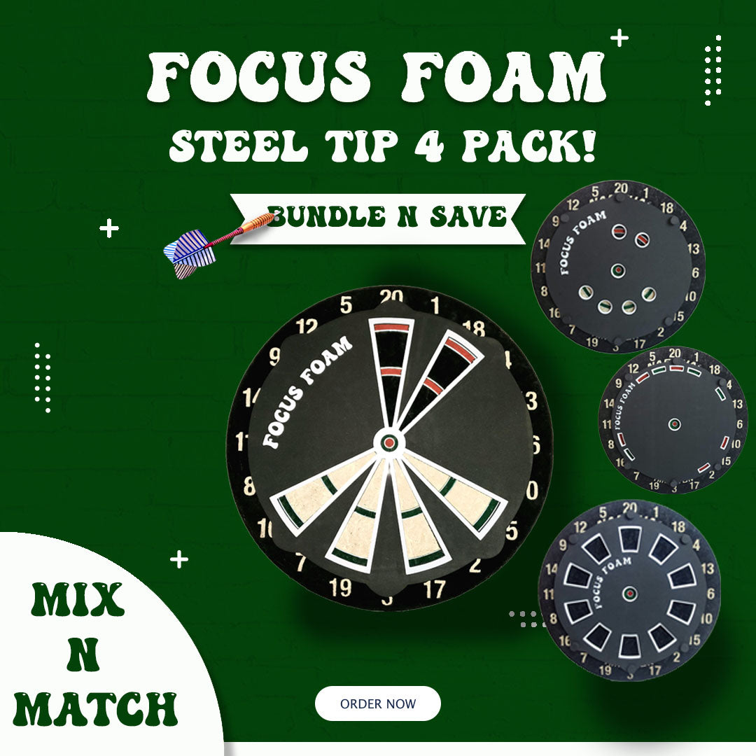 Focus Foam is a durable, long lasting training pad that overlays your dart board in a manner that doesn't throw off your perception. Our steel tip pads are 5mm thick and our soft tip pads are 4mm thick.